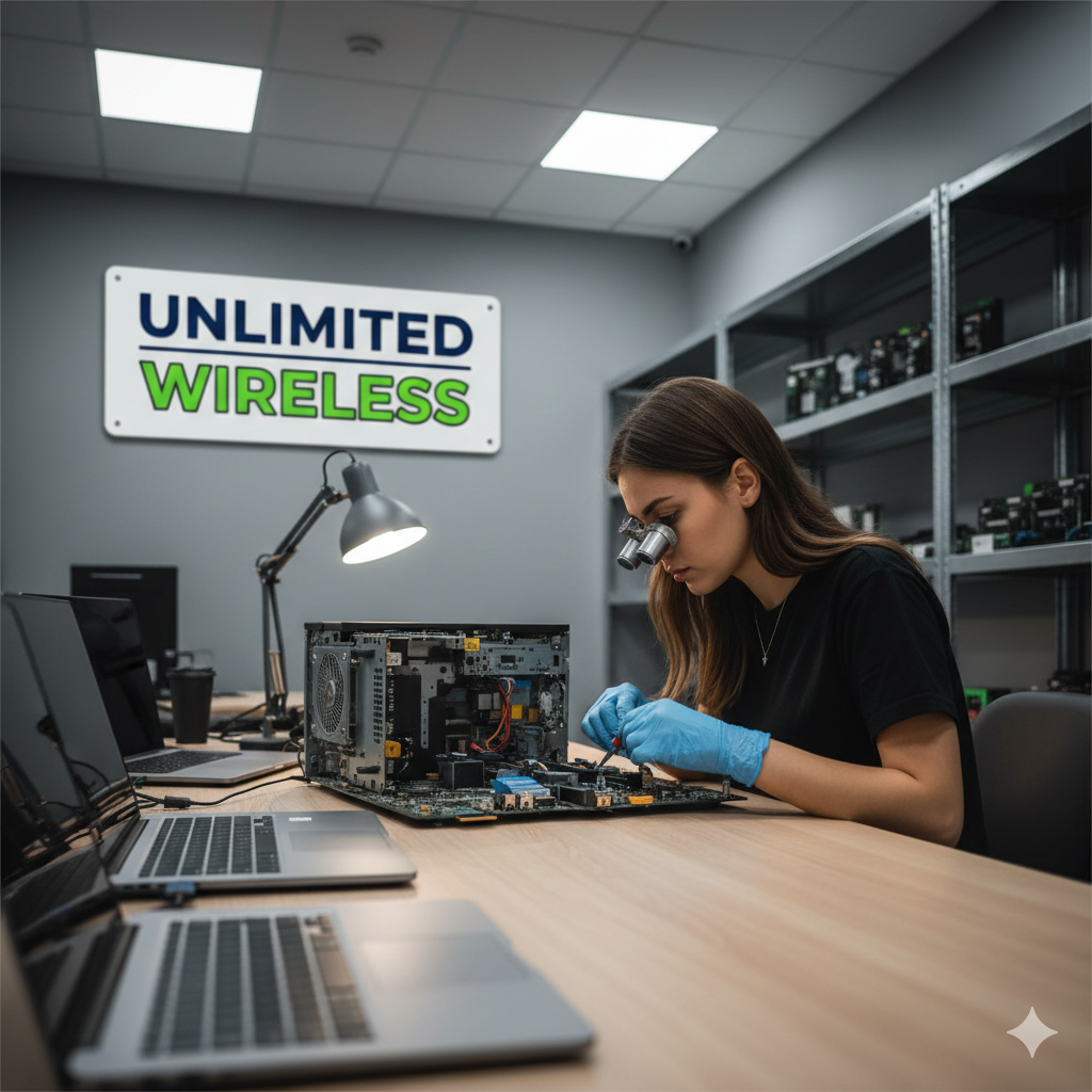 Unlimited Wireless specializes in mobile phone repair, including screen replacements, battery replacements, charging issues, speaker and camera repairs, and advanced diagnostics for iPhone, Samsung, and other major brands. In addition to smartphone repair, we also service laptops, tablets, and game consoles, addressing both hardware and performance-related issues.